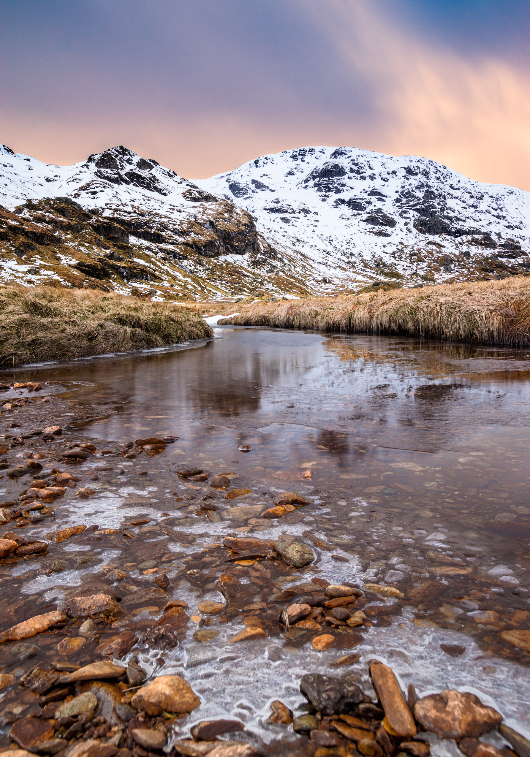 The applications Focus projects is specifically advertised for include nature macro photography, product photography, still life, architectural and interior photography and microscope photography. There is no mention of landscape photography, even though this field frequently requires the merging of exposures that were focused on different areas. Images shot with ultra-wide angle lenses that include foreground details close to the camera are usually impossible to capture in one exposure, the solution is to combine two (or sometimes three) images, one focused on the foreground close to the camera, another focused either to infinity or according to hyperfocal distance estimates. So far I have simply merged these exposures through layer masks and gradients in GIMP or Affinity Photo, but with a dedicated focus merge software at hand, naturally I decided to give it a shot. The image below was taken about two weeks ago in the highlands close to Loch Lomond, the first shot was focused at the rocks and ice in the foreground, in the second one the focus was on the snow-covered mountains. Both frames were taken at f/8, 20 sec., ISO 100 at 17 mm (APS-C).