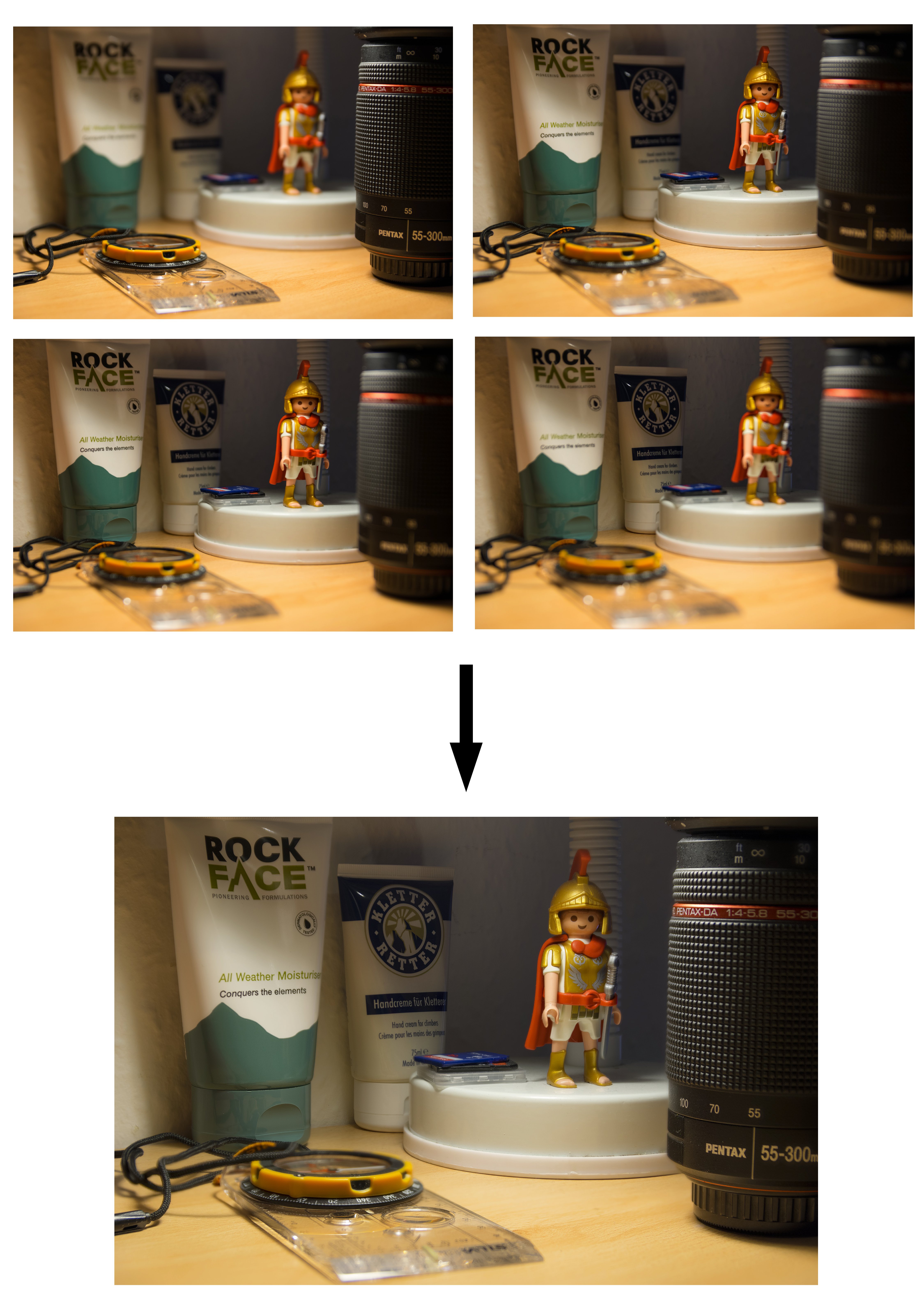 The following test scene consists of varying objects on my desk. It was shot with my K3 and the Sigma 17-50 f/2.8 HSM at f/3.5, 1/80 sec., ISO 200. The camera was mounted on a stable aluminium tripod, however the floor in my room is carpet which does not exactly benefit pixel-level precision. I took four images, with the focal points being on the closer edge of the compass housing, the close surface of the lamp’s stand, the close edge of the stack of SD cards and the logo on the moisturiser tub in the background, furthest away from the camera. Minor adjustments were made in Adobe Lightroom, especially some sharpening was applied, the exposure was raised slightly and the white balance was normalised to achieve a more neutral tone.