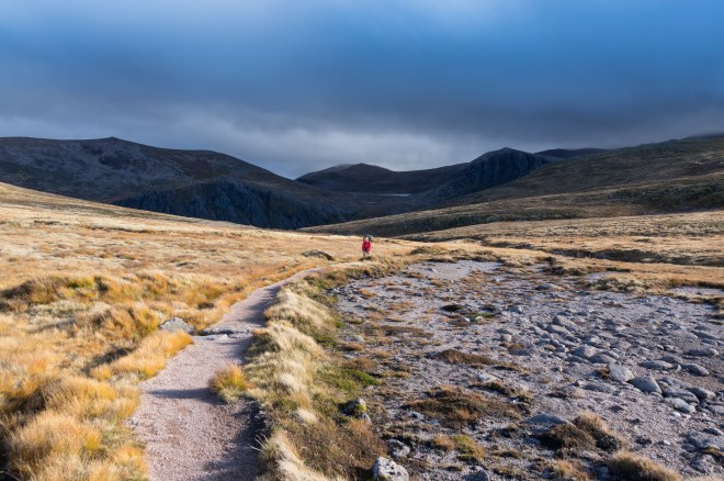 The picture shows Sophia emerging onto the plateau from Loch Avon in the last sunshine just before Storm Ali hit the area. We proceeded up Cairn Gorm where we were almost blown over, then sprinted down to the Ski Centre to luckily meet the owner of the last car in the car park who gave us a lift down into Glenmore.